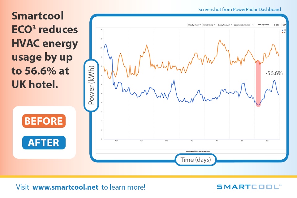 At a London hotel, analysing the load profile of four heat pumps led to the installation of Smartcool ECO3 optimisation. The result was a 56.6 per cent reduction in peak HVAC energy use and a 39 per cent reduction when comparing consecutive weeks.